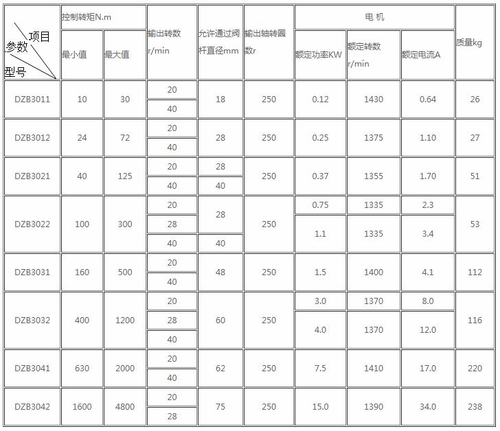 四、DZB系列閥門電動(dòng)裝置主要技術(shù)性能參數(shù)表