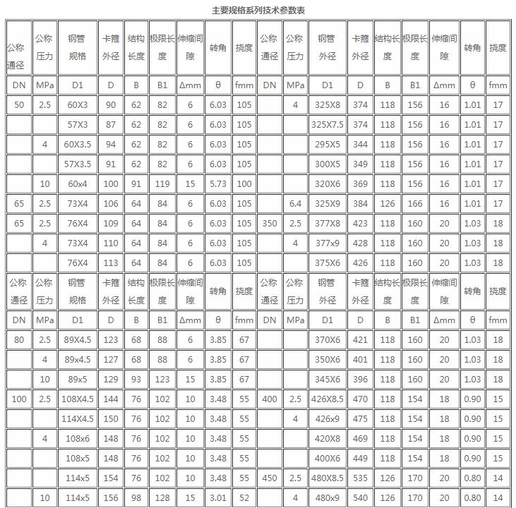 本系列卡箍式柔性管接頭是按國家標(biāo)準(zhǔn)管徑配套和根據(jù)鑄石復(fù)合管,管徑配套設(shè)計,每項通徑分幾種規(guī)格,如工程中還需其它規(guī)格管徑在訂貨時注明我廠可進(jìn)行設(shè)計配套卡箍。